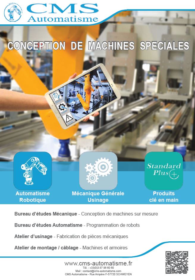 CMS Automatisme est spécialisée dans la conception de machines sur-mesure selon le cahier des charges du client. L’entreprise intègre toutes les étapes de la fabrication d’une machine spéciale en interne pour vous proposer des solutions automatisées / robotisées prêtes à l’emploi pour votre production. Vous avez besoin d’assembler des éléments, d’usiner, de contrôler, de manutentionner vos produits ; nous vous proposons la solution complète intégrant les procédés dont vous avez besoin. Nous concevons selon les normes actuelles et intégrons des technologies récentes et innovantes pour vous garantir des équipements durables à la pointe de la technologie. L’industrie 4.0, comme la maintenance préventive ou le contrôle non destructif, est au cœur de la conception de nos machines pour en garantir une utilisation moderne, constante et fiable.